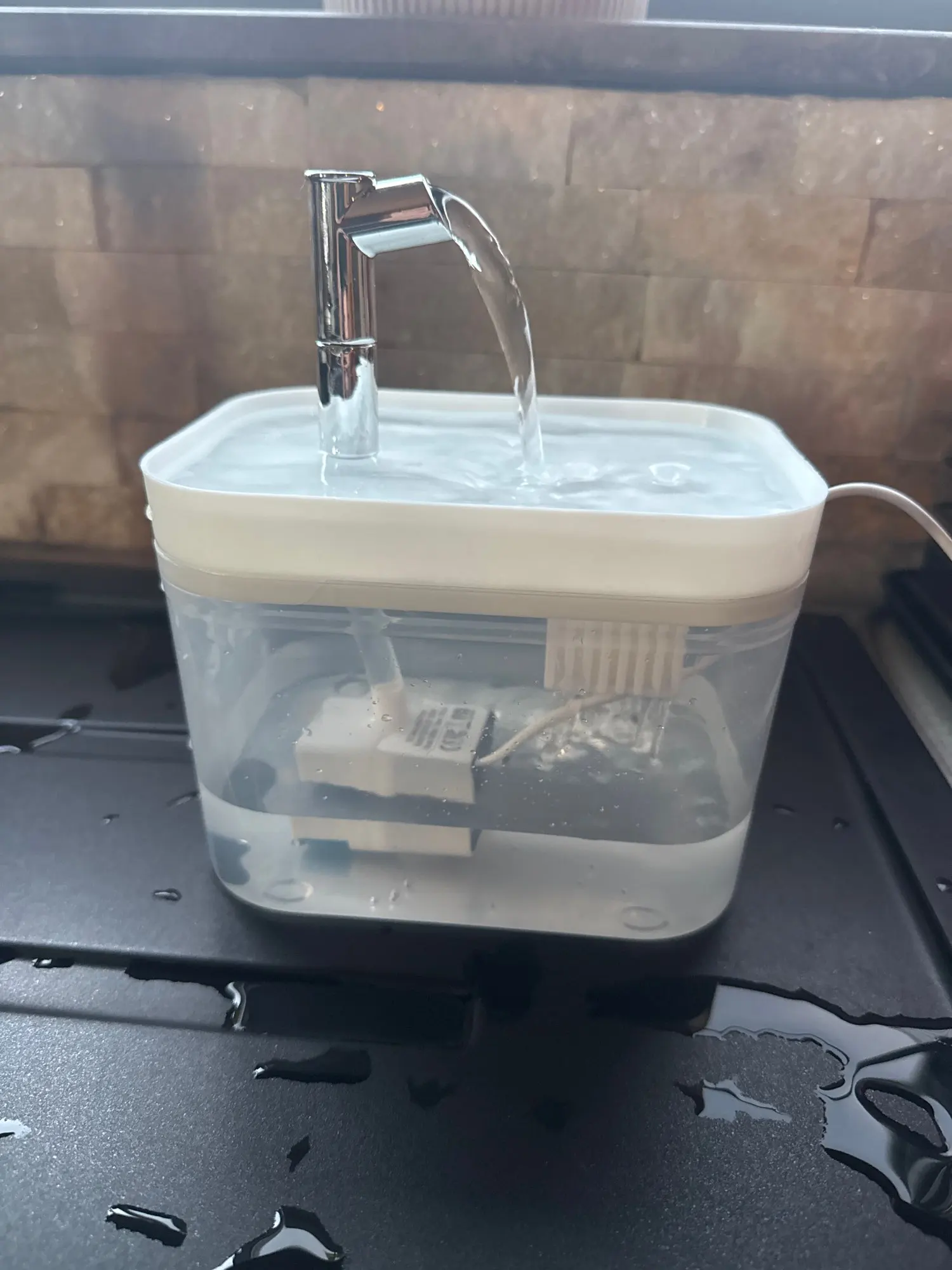 Keep the fountain protected from drops or impacts. Always check the pump, cable, and internal parts before use, as damaged electronics can be unsafe for pets.